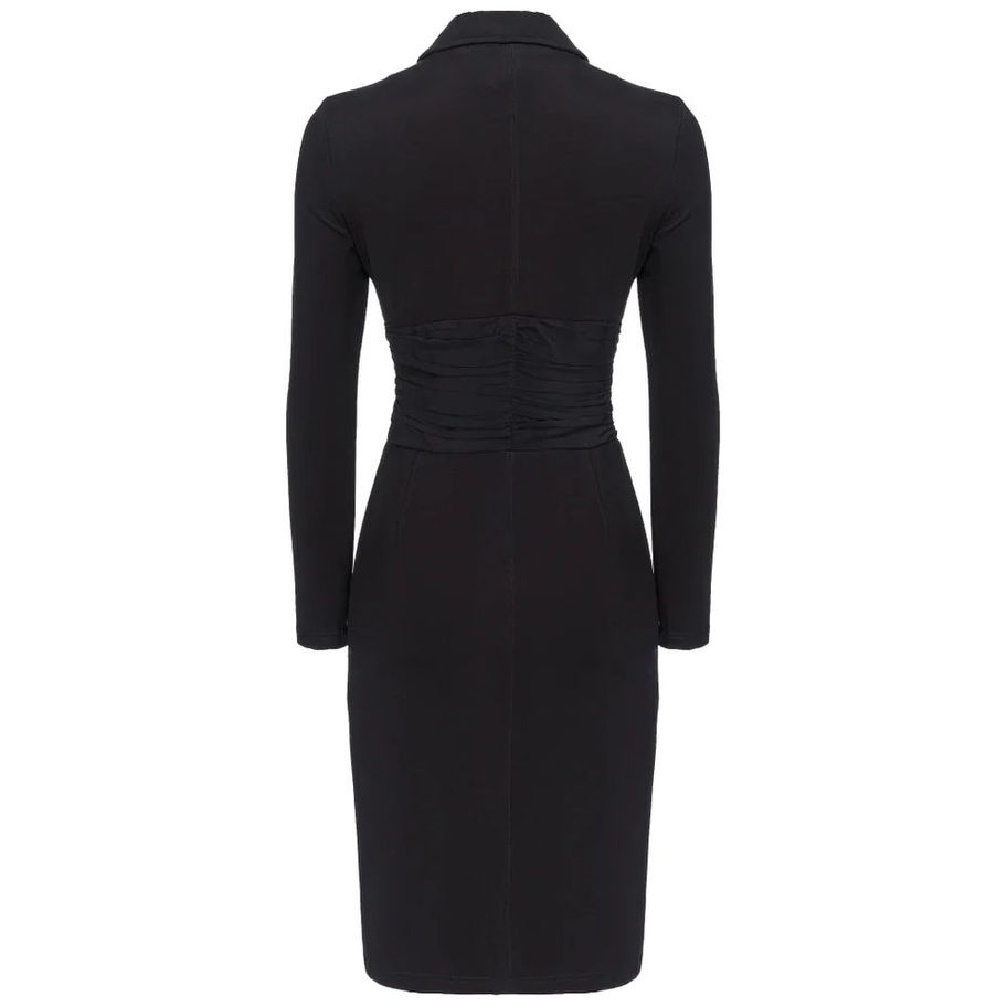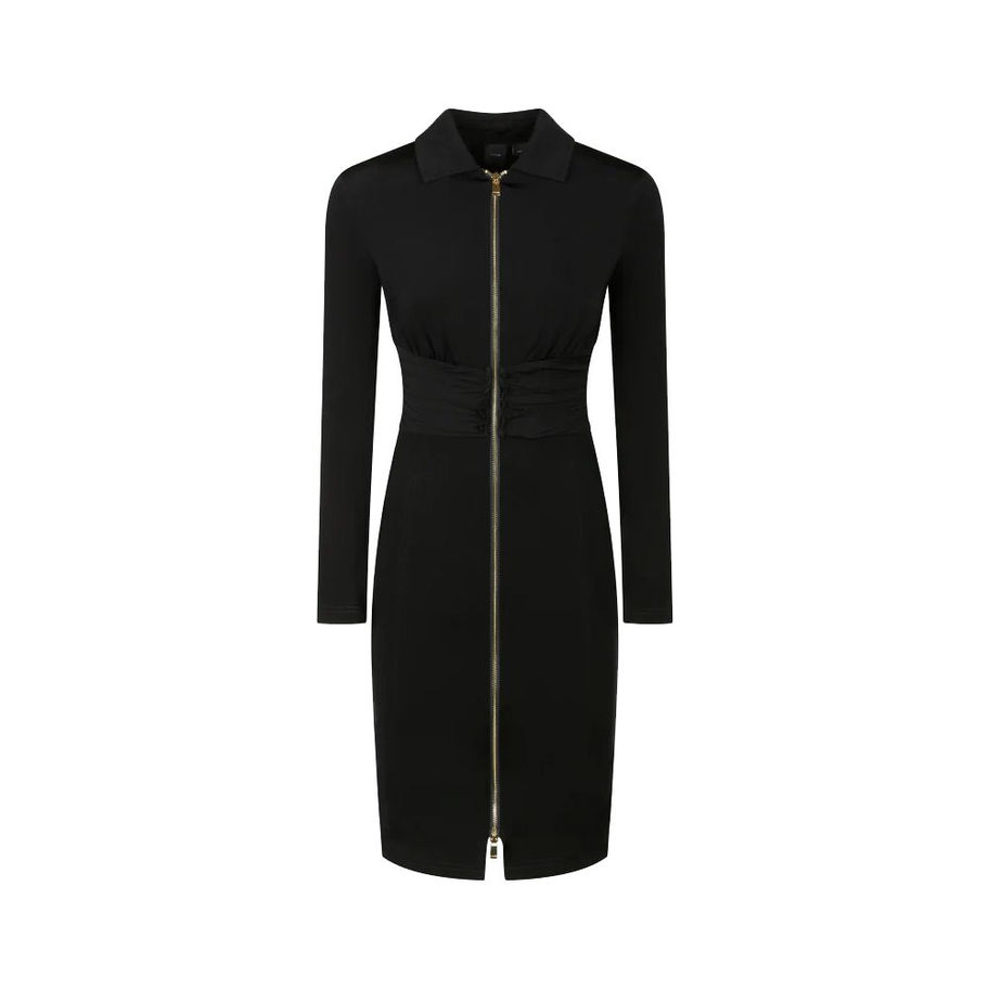 Pinko dress in technical stretch viscose fabric with a fluid neoprene effect and a gathered georgette band detail on the chest. Fitted line with a shirt collar and long sleeves. Front metal zip fastening