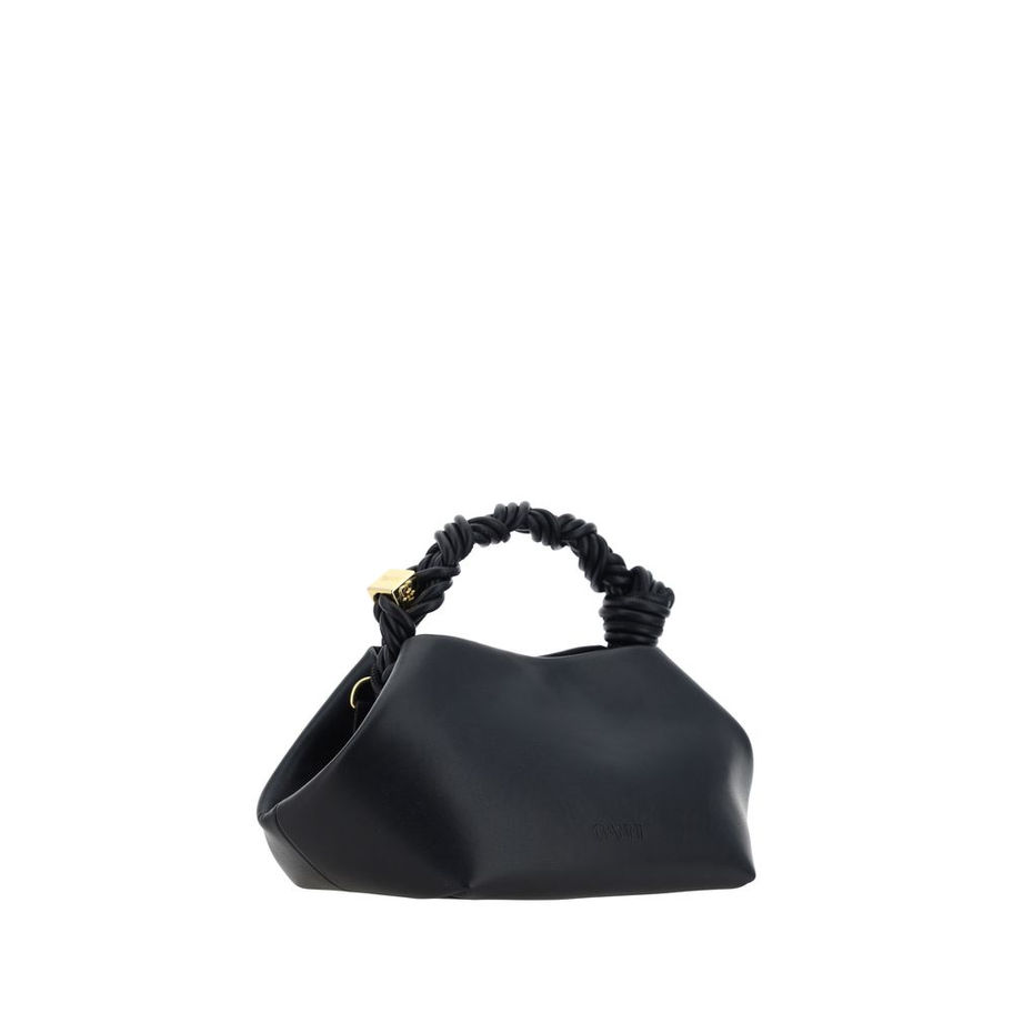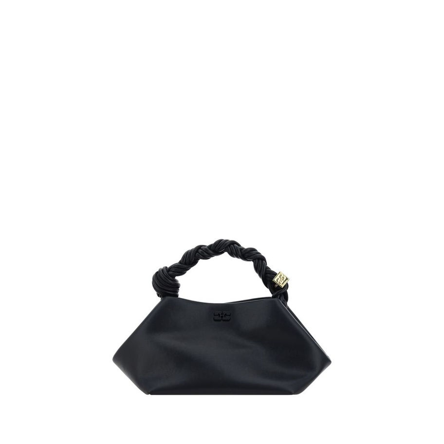 Certified Recycled Leather Bou Handbag by Ganni, interior magnet closure, removable and adjustable flat shoulder strap, top handle with braided detail, hexagonal bag design, three-dimensional and matching plaque appliqué on front, interior welt pocket, double interior compartment, metal dice with brand logo and Butterfly engraved and applied to handle.