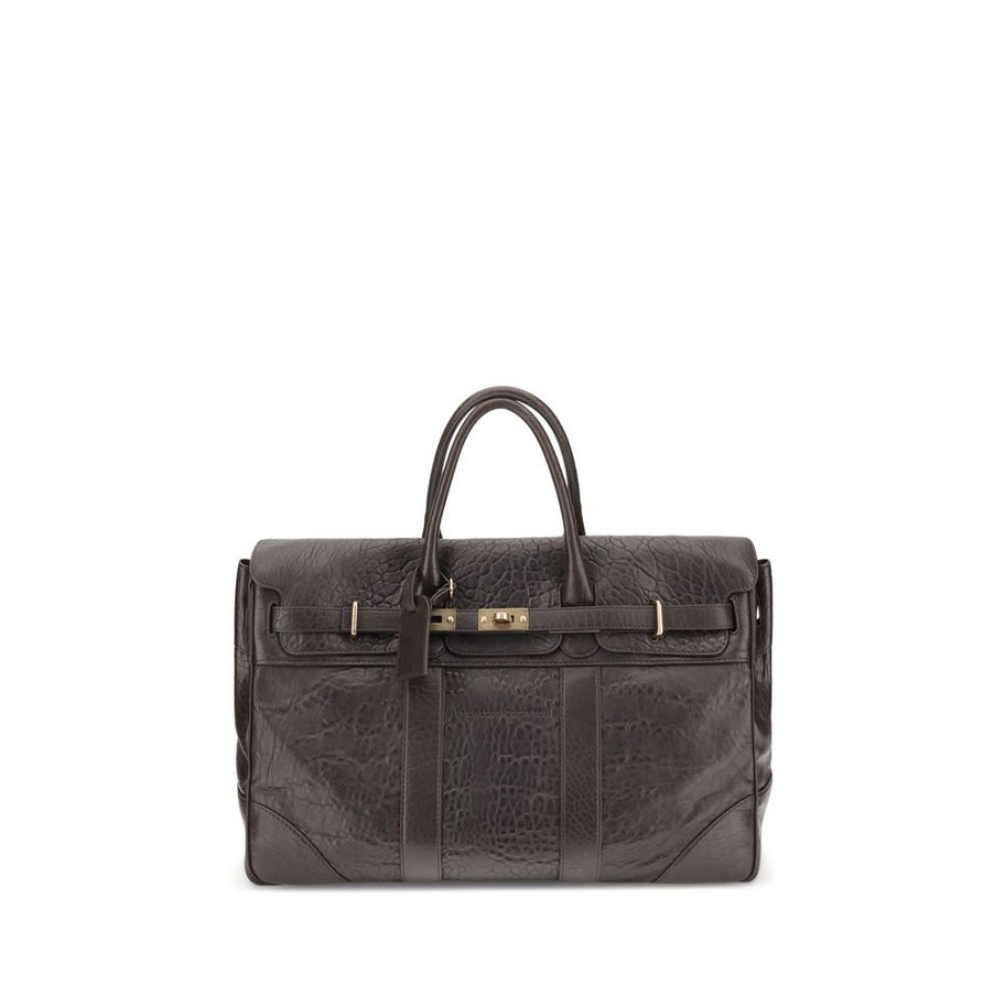 Country leather Travel Bag with textured grain by Brunello Cucinelli, elegant and durable. Featuring two tubular top handles for a comfortable grip, it has a front flap closure enhanced with a peg for security and practicality. Inside, a single large compartment offers functional space for all personal effects. A refined accessory perfect for travel with style and class.