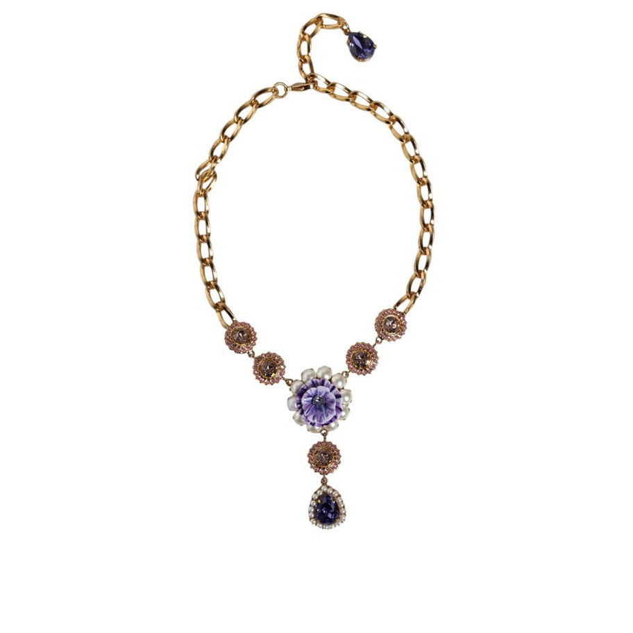 Brand: Dolce & Gabbana Product: Gold Brass Crystal Purple Pink Pearl Pendants Necklace Condition: Brand new with tags Model: Statement charm necklace Motive: Floral Materials: 60% Real Brass 20% Glass 15% Pearl 5% Plastic Color: Gold pink purple Length: 53cm Closure: Lobster clasp Details: Logo details Made in Italy Size on Tag: One Size