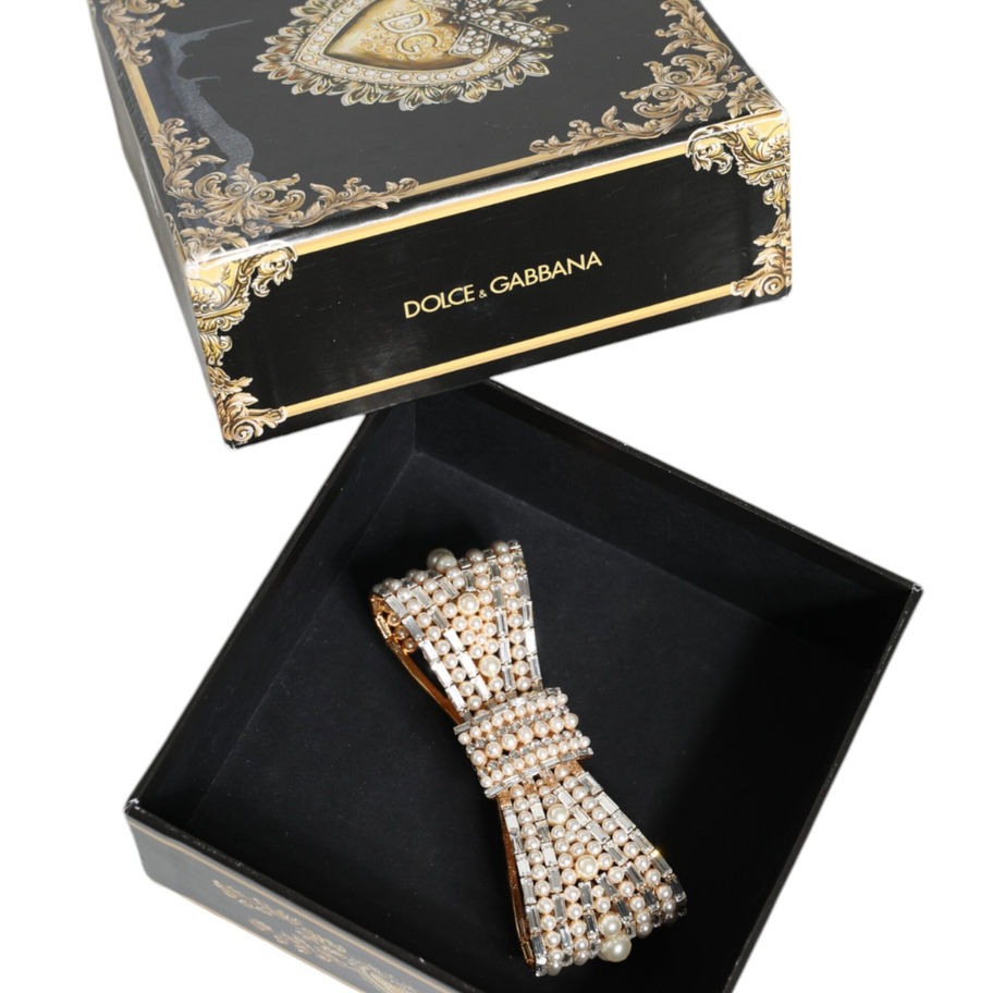 Gorgeous brand new with tags and box, 100% Authentic Dolce & Gabbana bow pin brooch with crystal and faux pearl embellishments. Color: Gold, white pearls and crystals Model: Pin brooch Material: 70% Real Brass 30% Real Crystal Length: 12cm Made in Italy Logo details