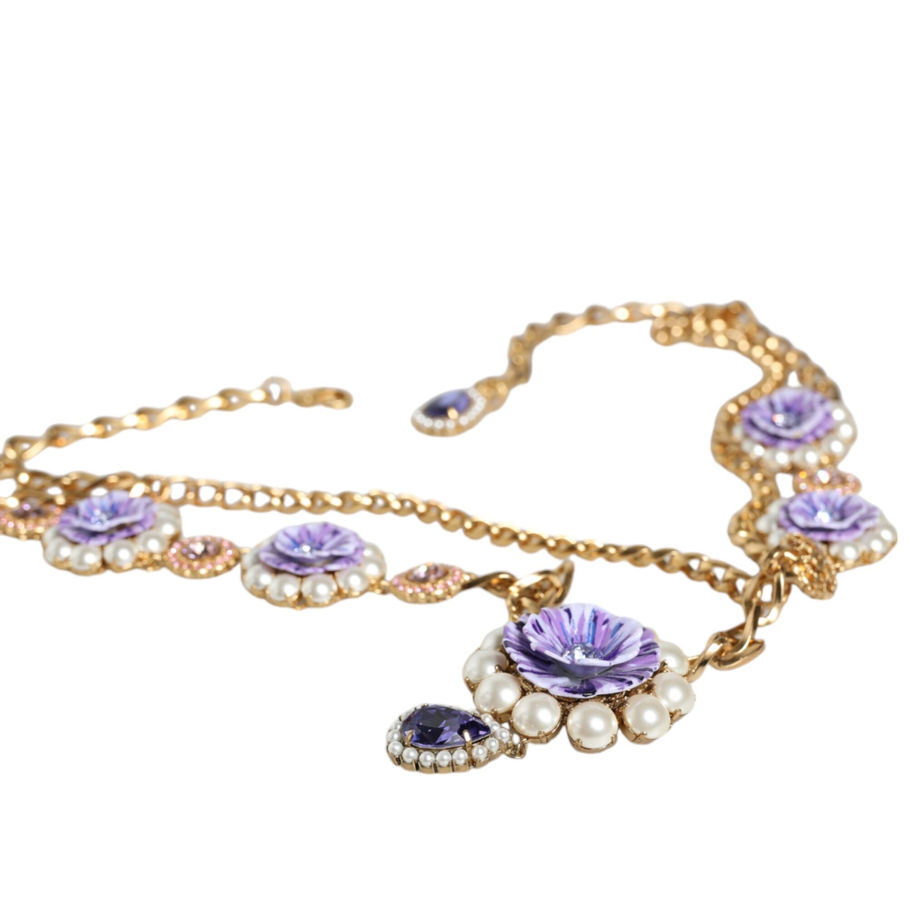Gorgeous, 100% Authentic Dolce & Gabbana gold-tone necklace. Decorated with colorful charms featuring a floral motif. Encrusted with purple decorative elements. Model: Charm necklace Motive: Sicily Material: 50% Real Brass 25% Glass 20% Resin 5% Plastic Colour: Gold Crystal: Purple and clear Length: 77cm Lobster clasp closure Logo details Made in Italy