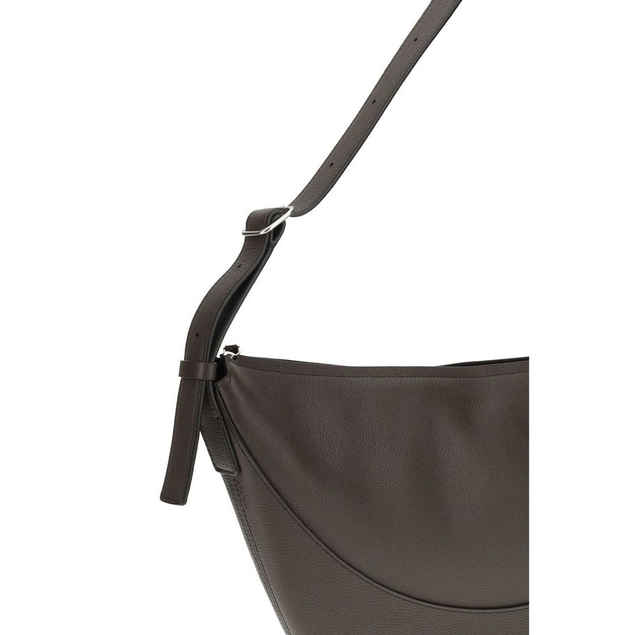The Jouve Shoulder Bag by The Row is a sophisticated accessory with a half-moon design, crafted from high-quality leather. The flat, adjustable shoulder strap ensures comfort and versatility, while the zippered top closure offers security and convenience. Perfect for those seeking a balance between elegance and functionality, this bag easily complements any look, adding a touch of understated sophistication.