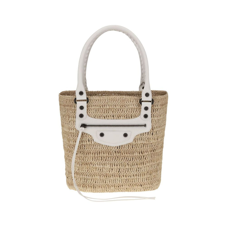 Balenciaga’s Le City Small Straw Shoulder Bag is an accessory with a bold and sophisticated style. Featuring two hand-woven leather handles, it has an adjustable and removable shoulder strap that enhances its versatility. The design is embellished with a decorative zipper with knotted leather puller at the front and brass hardware. The top opening leads to a large main compartment, perfect for storing essentials with elegance.
