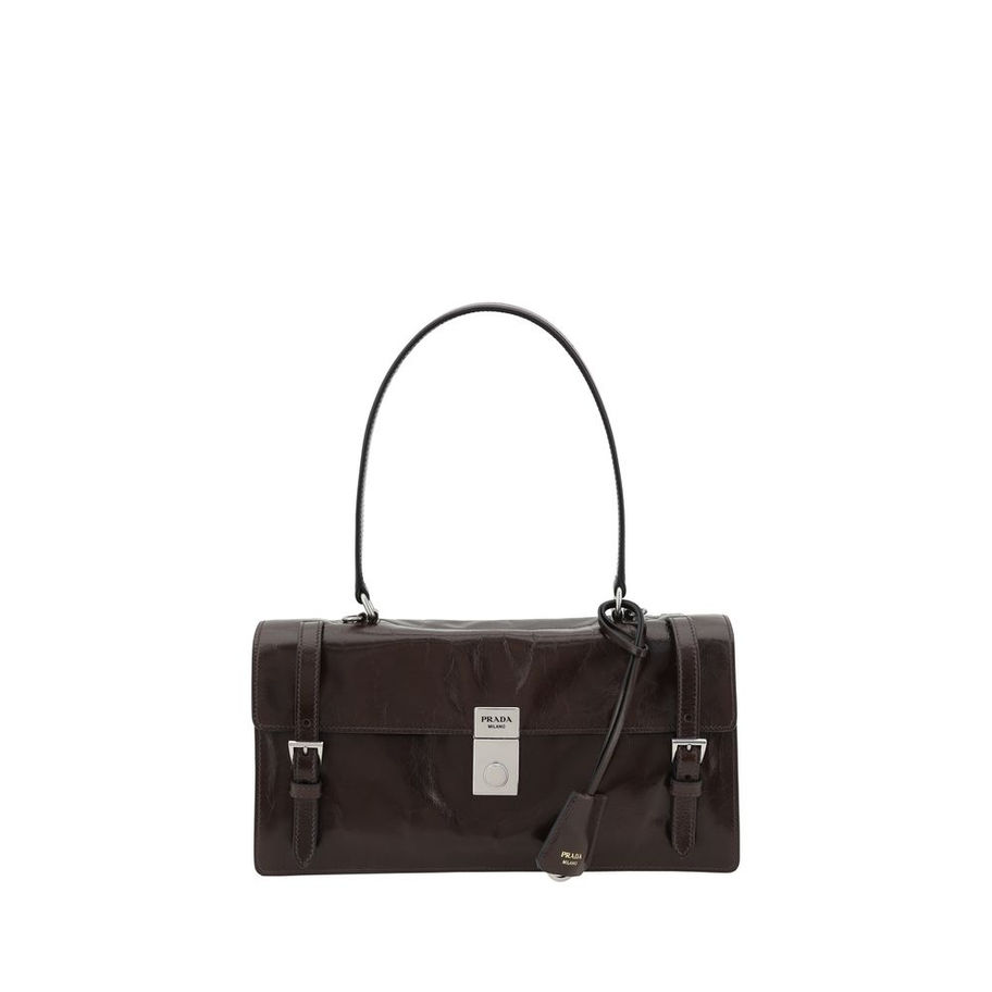 Prada’s leather Shoulder Bag is elegant and refined, with a flat handle that enhances the design. Made of polished leather, it features a front flap closure with a logoed clasp, a distinctive detail of the brand. Side buckles add a touch of style, while the external back pocket offers practicality. A sophisticated and versatile accessory perfect for any occasion.