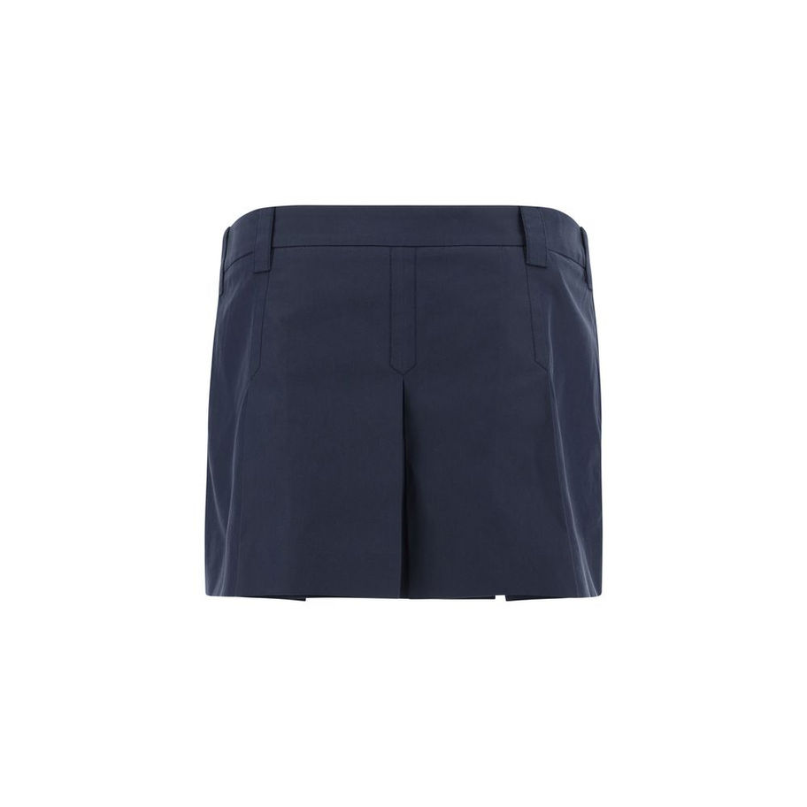 Cotton Mini Skirt by Miu MIu, pleated design, concealed side zipper closure, two side welt pockets, contrasting iconic monogram on front, waistband loops.