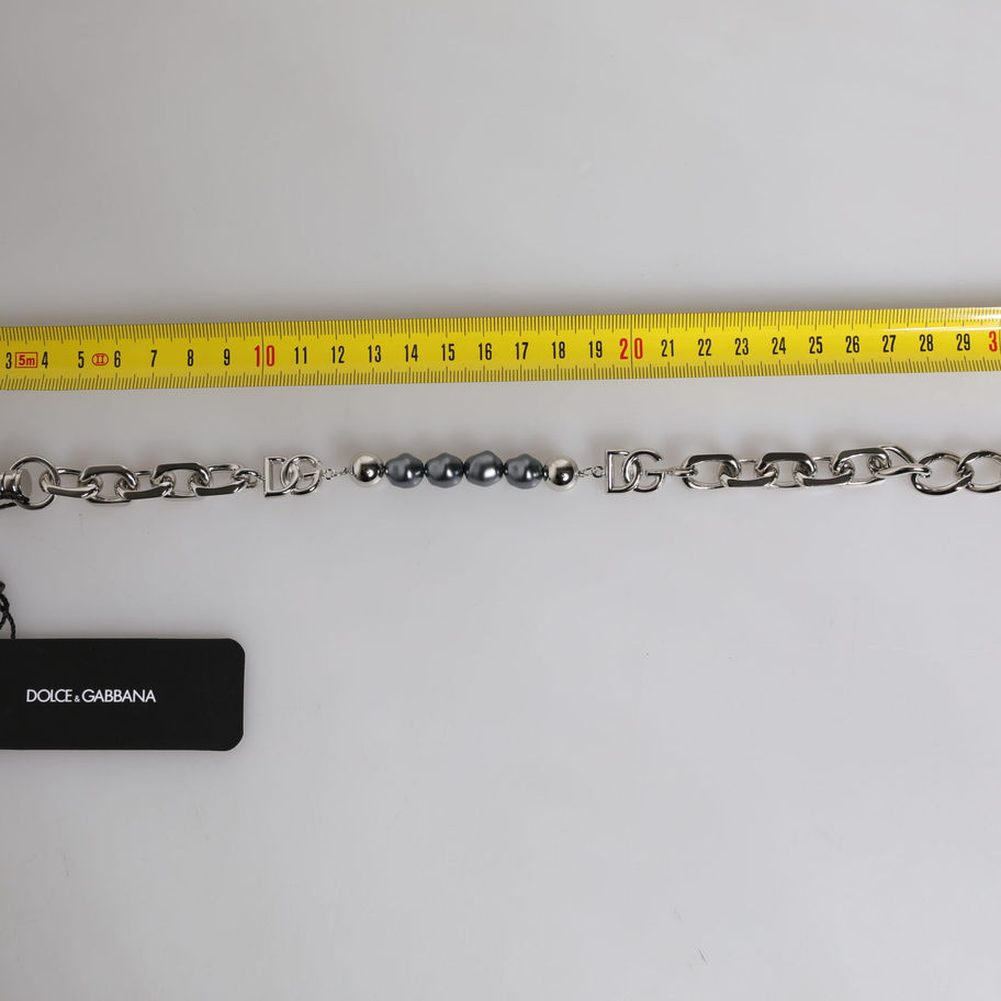 Gorgeous brand new with tags 100% Authentic Dolce & Gabbana silver-tone chain bracelet, a perfect blend of elegance and contemporary edge. Featuring an intricate mix of polished metal links and signature DG logo details, this statement piece is adorned with lustrous dark-hued pearls for a refined yet modern touch. The adjustable lobster clasp ensures a comfortable and secure fit, making it an ideal choice for both casual and formal occasions. Model: Chain bracelet Material: Silver-tone metal, pearls Color: Silver Length: 34 cm Lobster clasp with adjustable chain Logo details Chunky chain with pearl embellishments Made in Italy