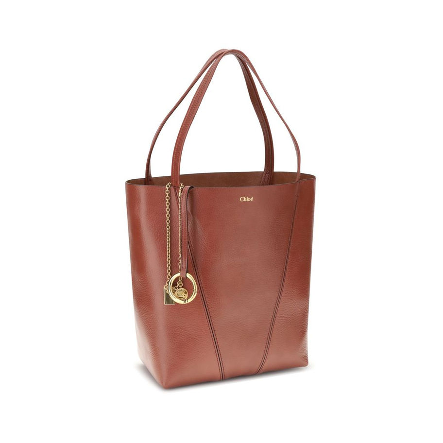 Leather Spin Shoulder Bag by Chloé is a refined and modern accessory featuring a sleek grained leather design. The two flat top handles offer a comfortable and practical grip, while the brand’s iconic monogram, press-stamped on the front, adds a distinctive touch of luxury. The closure of the bag is made via a ring that holds the two handles together, an element that gives it a unique and functional look. A fascinating detail is the chain with a pendant bearing the iconic logo applied to the handle. The interior of the bag consists of a single compartment.