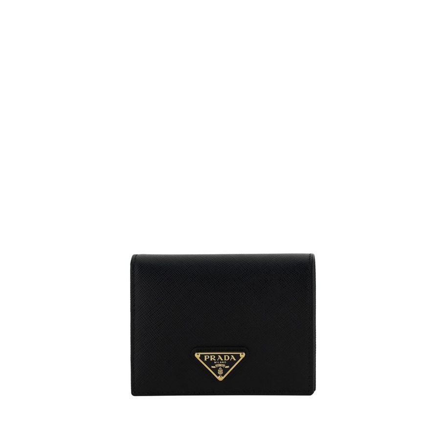 Calfskin Wallet by Prada, bill fold with snap button closure, triangle logo plaque on front, internal card slots, bill compartment and snap button coin pocket.
