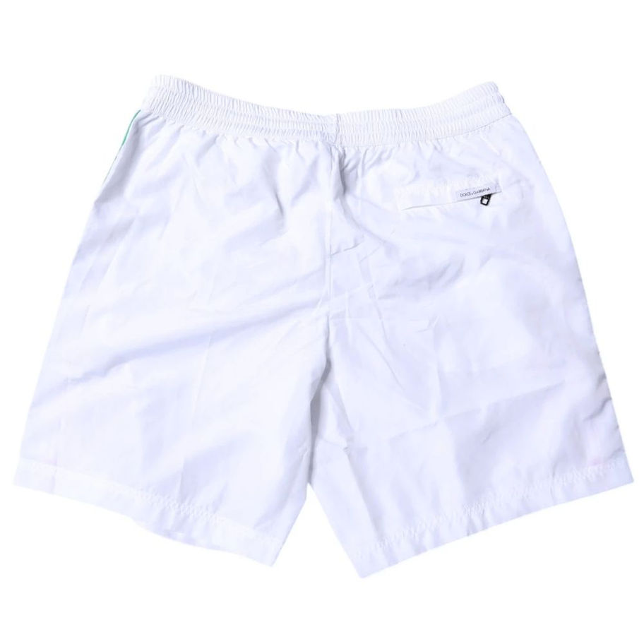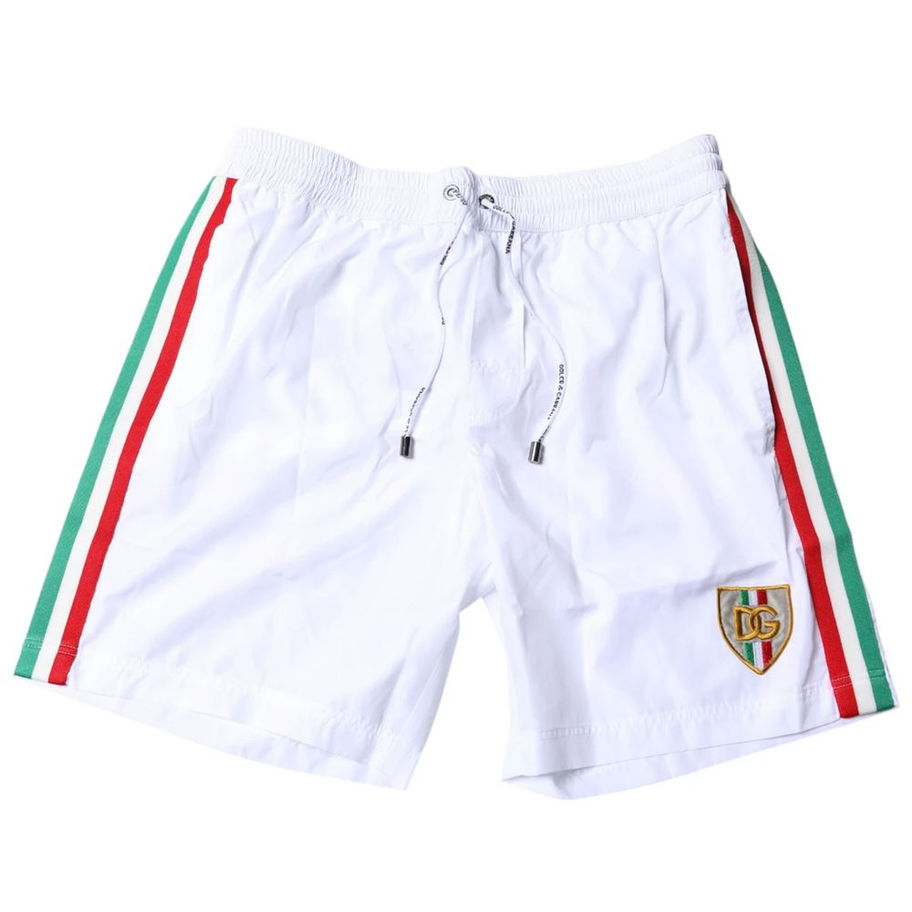Dolce & Gabbana boxer shorts with elastic waistband and drawstring, two side pockets and back pocket with zip fastening, tricolour side band and embroidered logo patch on the front.